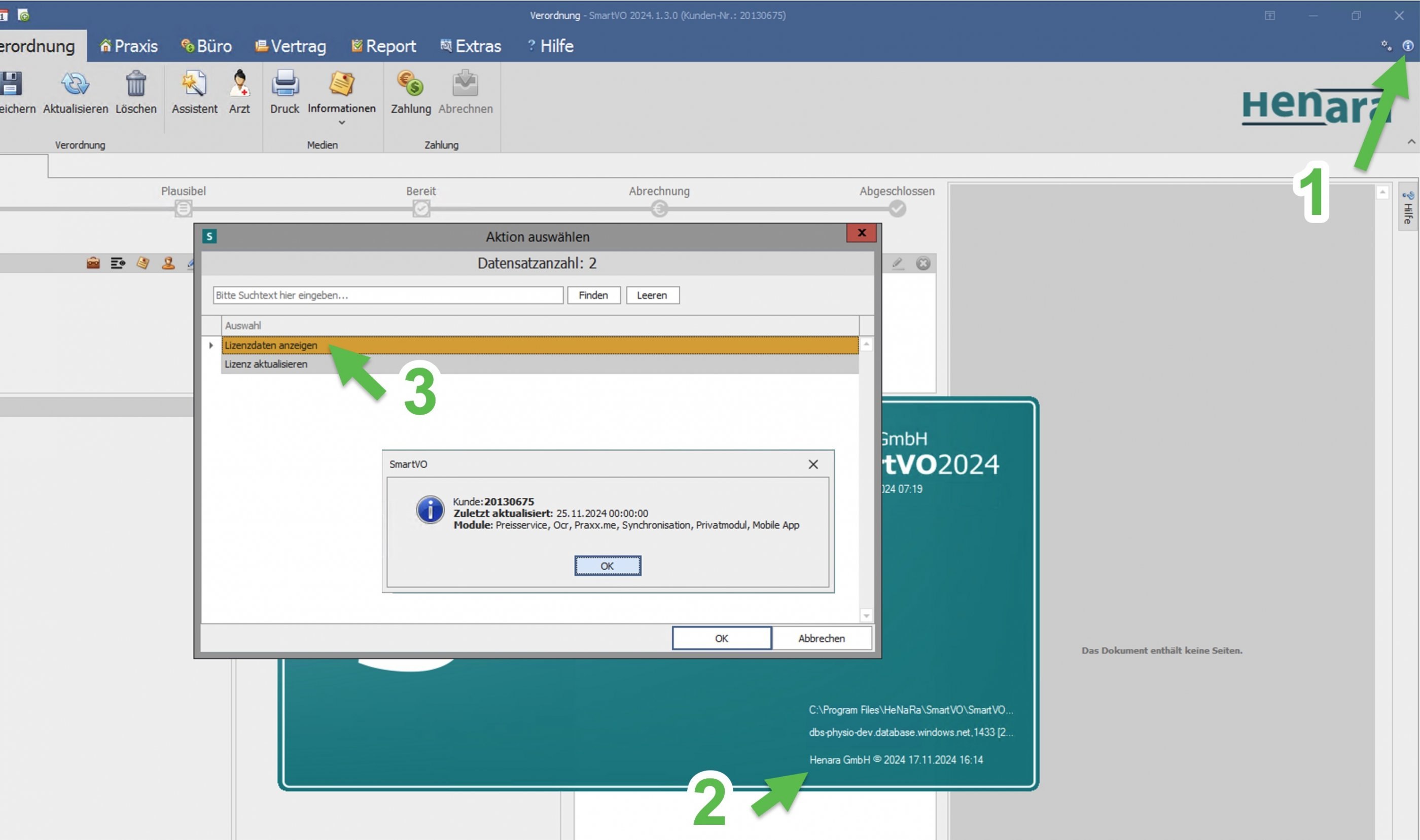 Um herauszufinden, ob Ihrer Praxisgruppe bereits die Praxx.me-Lizenz zugeordnet ist, können Sie in SmartVO die entsprechenden Informationen anzeigen lassen. Klicken Sie in SmartVO in der Verordnungsmaske auf das „i“ am oberen, rechten Rand (1). Im nun angezeigten „Splashscreen“ klicken Sie auf den Text „Henara GmbH“ (2) und anschließend doppelt auf die Option „Lizenzdaten anzeigen“ (3). Im Bereich „Module“ wird der Eintrag „Praxx.me“ zu finden sein, sollte die Lizenz bereits freigeschaltet worden sein.
