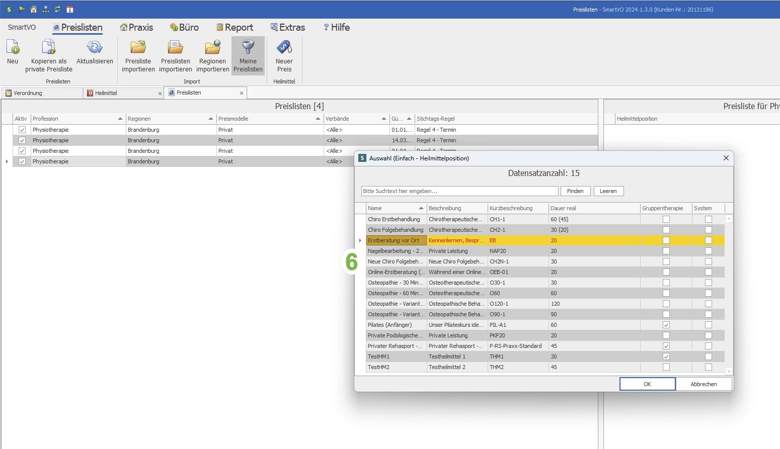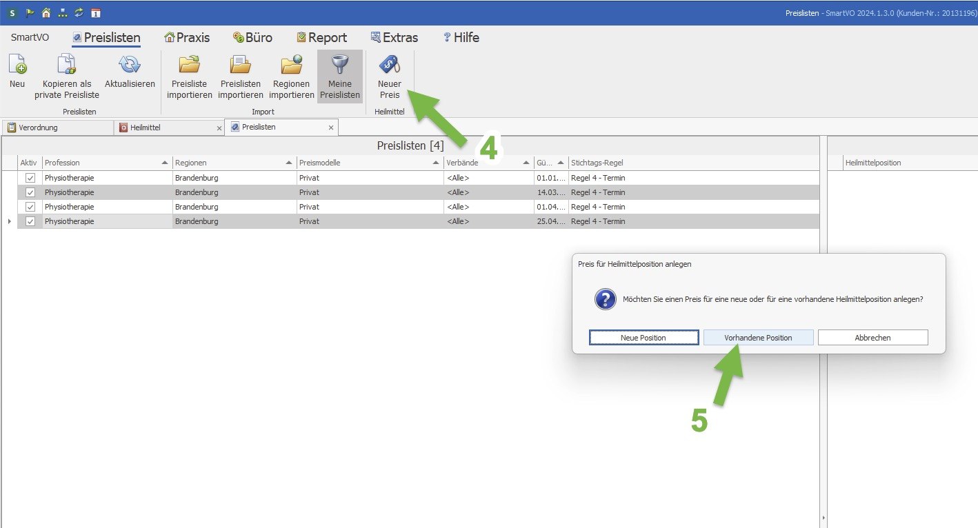 Screenshot: Auswahl einer Heilmittelposition zur Anlage eines neuen Preises in SmartVO
