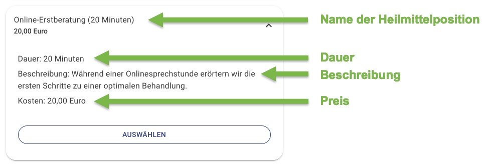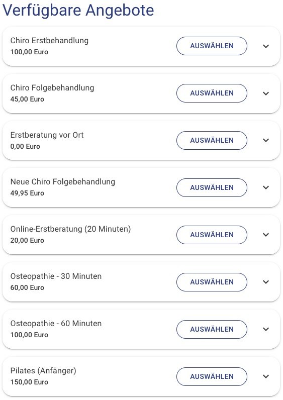 Der Ausgangspunkt einer jeder Buchung ist die Wahl des Angebots durch den Kunden. Sowohl in Praxx.me Express als auch in der Buchung im Praxx.me Portal werden alle Angebote veröffentlicht, welche Sie als Anbieter ausgewählt und eingerichtet haben. Damit Ihre Angebote am Ende tatsächlich eingeblendet werden, müssen Sie durch alle Schritte dieser Lektion gegangen sein. Im Kontext von SmartVO heißen die Praxx.me Angebote übrigens „Heilmittelpositionen“.